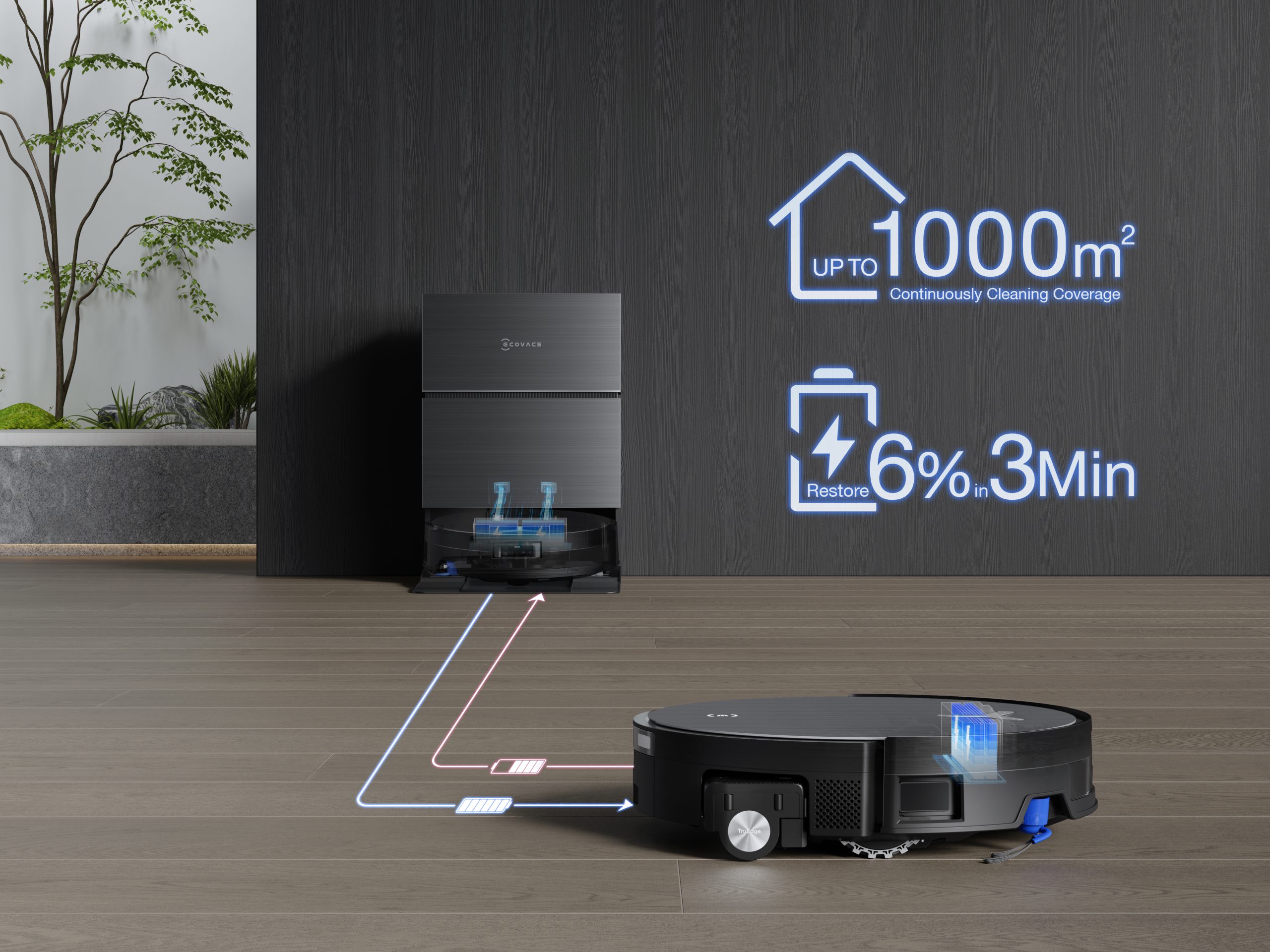 The PowerBoost Technology allows the DEEBOT to quickly recharge during routine mop-cleaning intervals and restore 6% of its battery power in 3 minutes. As a result, X11 enables an ​intelligence-driven perpetual run for truly consistent cleaning coverage up to ​1000㎡, even at max settings, ensuring consistent performance across large areas without manual intervention.