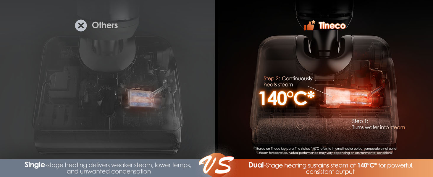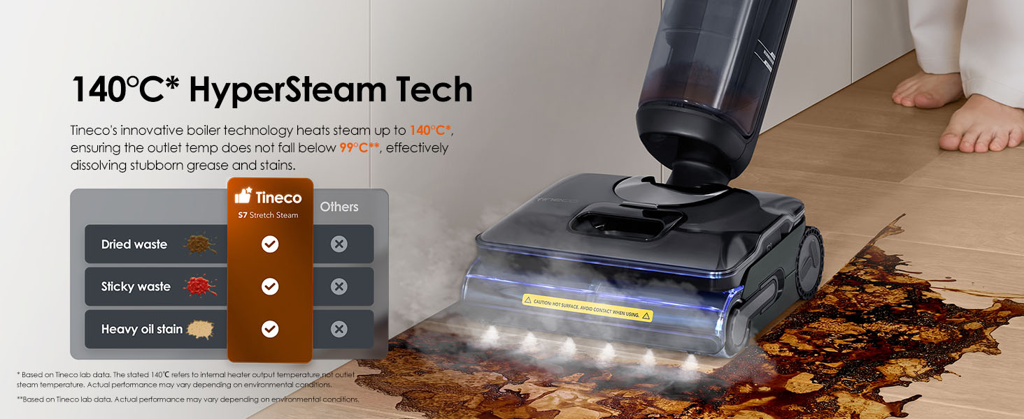 Tineco's innovative boiler technology heats steam up to 140°C, ensuring the outlet temp does not fall below 99℃.