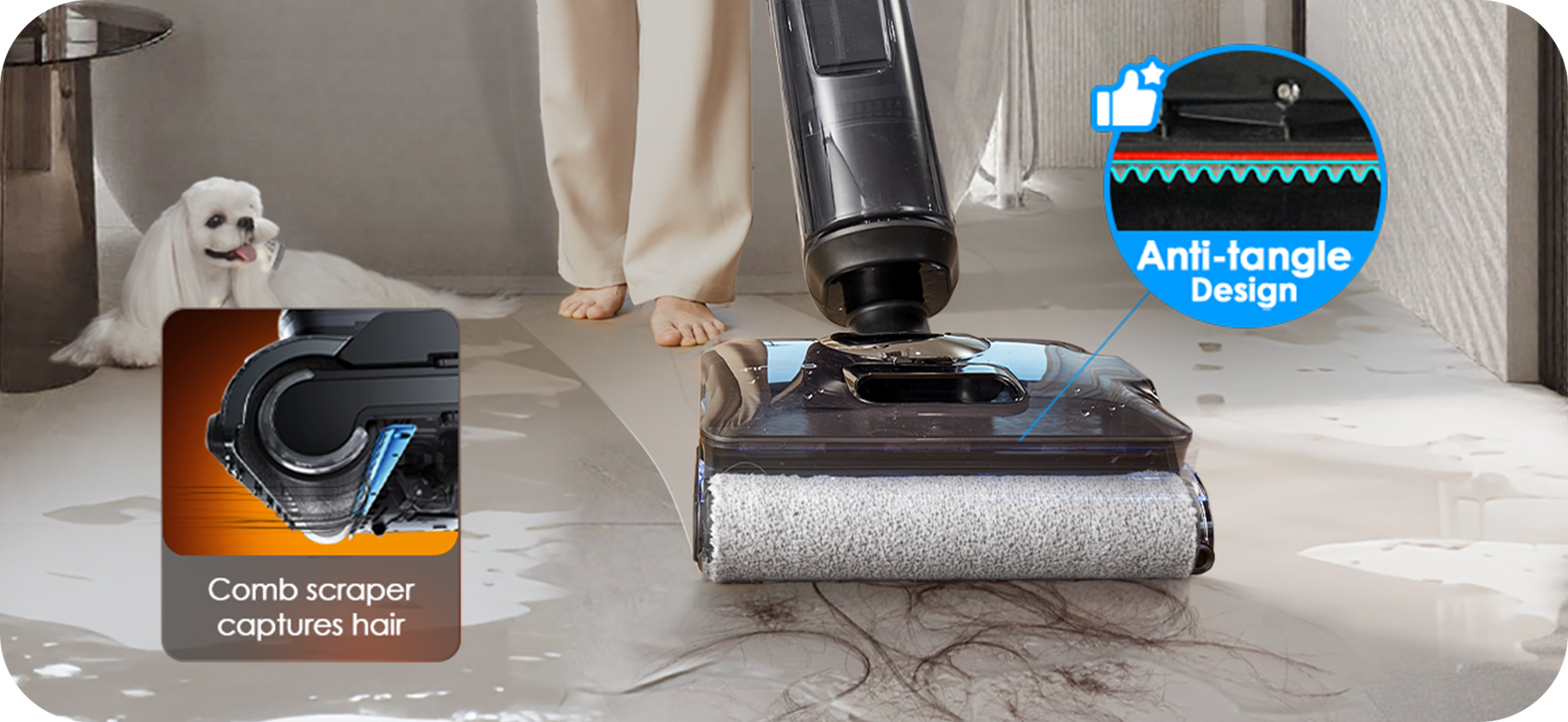 Both scrapers remain tightly aligned with the roller brush, ensuring long-lasting anti-tangle performance.